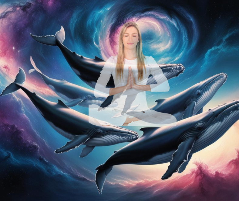 Open to receive an energetic transmission and guidance from the Whales who swim around you in a galactic sky.